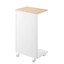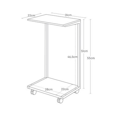 Njena konstrukcija je kovinska, dopolnjena s ploščo iz furnirja v naravni barvi. Mizica je opremljena s kolesci za enostavno premikanje, če pa imate raje stabilno postavitev, lahko kolesca odstranite in uporabite priložene ravne nogice. Diskretna zadnja plošča, ki jo je mogoče obrniti, pomaga skriti vsebino in tako ohranja urejen videz. Zgornja plošča prenese največ 2,5 kg, medtem ko ima podstavek nosilnost do 5 kg.