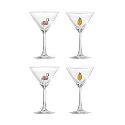 V kompletu sta dva kozarca s prikupnim motivom flaminga in dva z motivom bleščečega ananasa. Vsak kozarec je edinstven, saj je ročno pihan in izdelan. Prostornina posameznega kozarca je 170 ml.