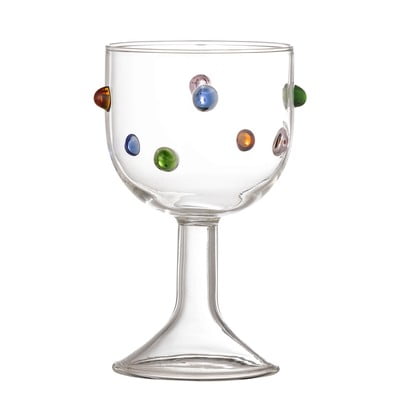 Ročno pihano steklo je okrašeno s pisanimi steklenimi kapljicami, kar daje kozarcu zabaven in barvit pridih. Kozarec ima prostornino 250 ml.