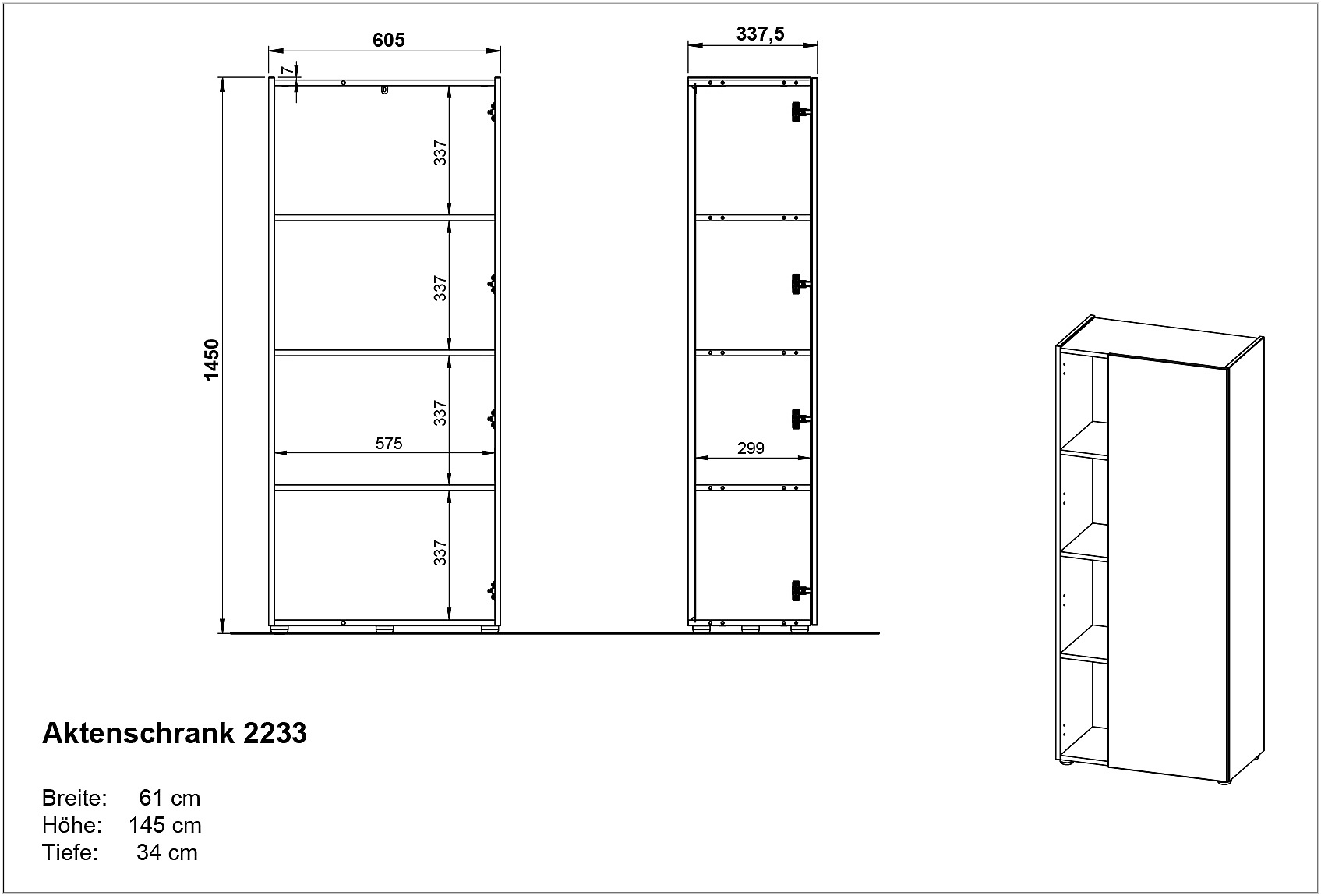 Knjižna omara Adrano iz podjetja Germania ponuja praktičen prostor za shranjevanje. Opremljena z vrati, za katerimi so tri fiksne police z nosilnostjo do 10 kg. Omari je priloženih pet zaščitnih blazinic za tla iz črne plastike. Vrata nimajo ročajev in jih je mogoče namestiti na desno ali levo stran. Površina je odporna proti praskam, robovi pa so odporni proti udarcem. Izdelana je bila v Nemčiji.