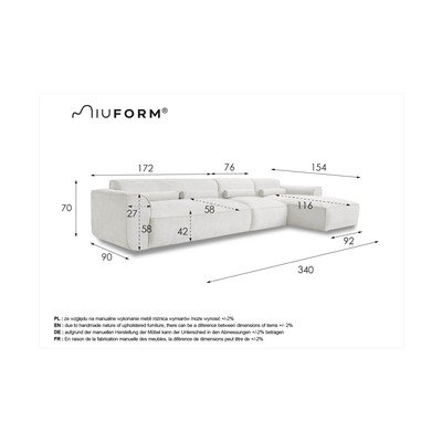 Desni kot/v obliki črke LKremno belaŠtirisedežnaŠirina 265 cmGlobina 169 cmGlobina sedeža 58 cm