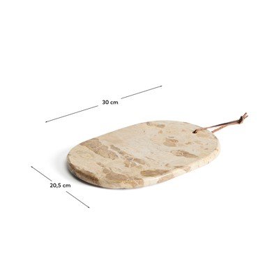 Pladenj je hkrati funkcionalen in dekorativen. Odpornost marmorja v kombinaciji z brezčasnim dizajnom zagotavlja dolgo življenjsko dobo in enostavno prilagajanje različnim stilom notranjosti. Za enostavno obešanje je opremljen s praktičnim usnjenim trakom.