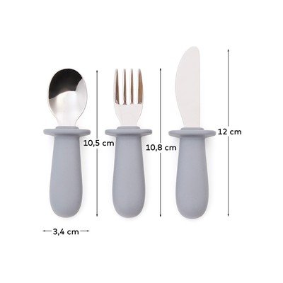 Set vsebuje žlico, vilice in nož. Vsi trije kosi imajo robustne, ergonomske ročaje iz silikona, ki so idealni za majhne otroške roke. Kovinski funkcionalni deli so trpežni, rezilo noža pa je topo in varno za otroke.