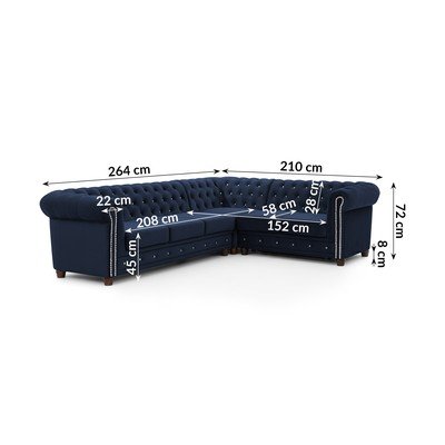 ŽametnaRaztegljivaChesterfieldDesni kot/v obliki črke LModraVodoodporna/odporna na madežeŠtirisedežnaŠirina 264 cm