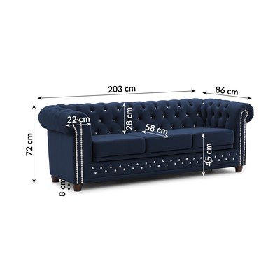 Žametna, raztegljiva, Chesterfield, modra, vodoodporna/odporna na madeže, dvosedežna, širina 203 cm