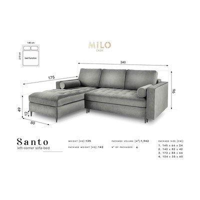 Milo Casa Santo, kotna raztegljiva sedežna garnitura z žametno površino, bo zagotovila odličen prostor za sprostitev za vso družino in notranjosti dodala pridih razkošja. Tkanine, ki jih uporablja ta blagovna znamka, so podvržene strogemu testiranju, da se zagotovijo vrhunska vzdržljivost, udobje in privlačen slog. Tako je bila za prevleko tega kavča uporabljena čudovita tkanina z rahlim sijajem in kratkim lasom, ki je zelo prijetna na otip in zelo odporna proti obrabi. Tehnika Liquid Blocked, uporabljena na tkanini, otežuje vpijanje tekočin, zato se tekočina zbira na površini materiala, ne da bi prodrla globoko v vlakna. Kava, čaj ali vino, ki se zlijejo na tkanino, se tako odstranijo v nekaj sekundah, če uporabite rahlo vpojno krpo ali papirnato brisačo.