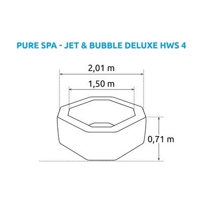 V paketu boste našli tudi dva podnastavka, termoizolacijski pokrov, grelnik, sistem za filtriranje, šobo črpalke, tri filtrske vložke, izolacijsko podlogo, napihovalno cev, vrečko, majhen plovec za bazenske minitablete, tester za klor, pH in alkalnost ter 5 m napajalni kabel. Hidro masažne kadi ni mogoče priključiti na solarni grelnik, klorinator ali peščeno filtracijo.