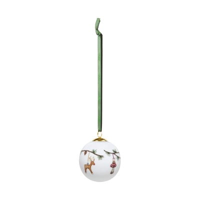Porcelansko kroglico krasi značilen motiv za to kolekcijo - borova veja z borovimi storži, na katere so obešeni božični okraski.
