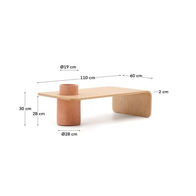 Kavna mizica Olaria iz Kave Home na izviren način združuje naravno lepoto lesa in terakote. Zaobljena mizica z dimenzijami 110 x 60 cm je izdelana iz jesenovega furnirja v naravnem odtenku in ima izvirno odprtino iz terakote, ki jo lahko uporabite na primer kot cvetlični lonec.
