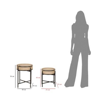 Premer večje mizice je 40 cm, njena višina pa 50 cm. Njena košara ima premer 36,5 cm in višino 9 cm. Manjša mizica ima premer 35 cm in višino 40 cm, njena košara ima premer 31,5 cm in višino 9 cm.
