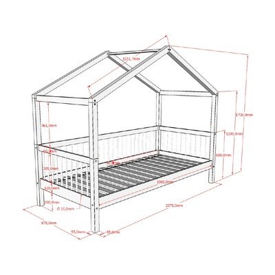 90x200 cm, v obliki hiške, z letvenim dnom, iz masivne bukve, površinska obdelava: lak, v naravni barvi