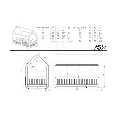 Otroška postelja MBW80x190 cm, v obliki hiške, z letvenim dnom, iz masivnega bora, površinska obdelava: brez obdelave/površinska obdelava: krtačenje, v naravni barvi
