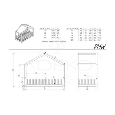 Otroška postelja RMW140x200 cm, v obliki hiške/z dodatnim ležiščem, s prostorom za shranjevanje, z letvenim dnom, iz masivnega bora, površinska obdelava: brez obdelave/površinska obdelava: krtačenje, v naravni barvi