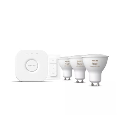 Začetni komplet Philips Hue vsebuje vse, kar potrebujete za vzpostavitev pametne razsvetljave v svojem domu. Komplet vključuje vmesnik Hue Bridge, tri pametne žarnice in stikalo z zatemnitvijo, tako da lahko takoj začnete upravljati želene luči.