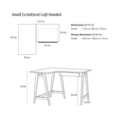 Pisalna miza Luka je opremljena s predalom velikosti 44,5 x 28,5 x 5 cm. Ta omogoča, da imate pri roki vse potrebno, hkrati pa uživate v prostornem delovnem okolju.
