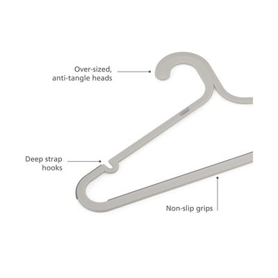Kljuke obešalnikov Orderly so ravne in velike, zato jih je enostavno namestiti in odstraniti z omarnega droga. Njihova oblika tudi preprečuje prekrivanje in lovljenje obešalnikov ali oblačil. Silikonske nedrseče površine na ramenih in palici za hlače zagotavljajo stabilnost oblačil. Globoki kavlji se uporabljajo za priročno obešanje trakov za obleke in zank za krila.