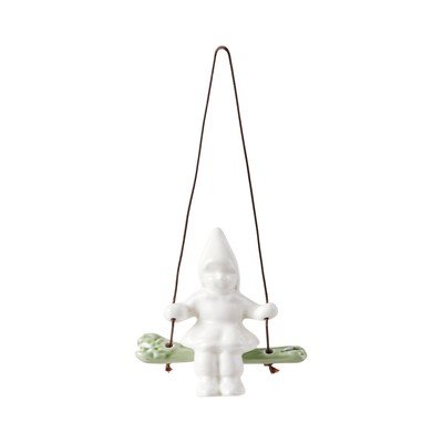 Keramični božični okrasek v obliki belo glazirane deklice z božično kapo in copati, ki sedi na zeleni mat glazirani gugalnici, vzbuja spomine na prijetne trenutke, preživete v zasneženi zimski naravi.
