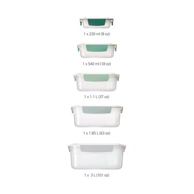 V kompletu boste našli pet škatel s prostornino 230 ml, 540 ml, 1,1 l, 1,85 l in 3 l. Zložene skupaj merijo 20 x 24,5 x 16,3 cm.