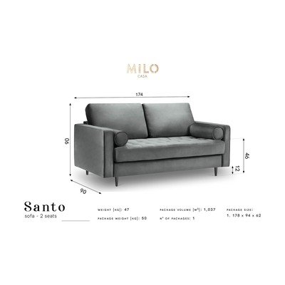 Žametni kavč Santo z dvema okrasnima blazinama zagotavlja odličen prostor za sprostitev ter notranjosti doda pridih dizajna in razkošja. Tkanine, ki jih uporablja blagovna znamka Milo Casa, so podvržene strogemu testiranju, da bi zagotovili vrhunsko vzdržljivost, udobje in privlačen slog. Tako je bila za prevleko tega kavča uporabljena čudovita tkanina z rahlim sijajem in kratkim lasom, ki je zelo prijetna na otip in zelo odporna proti obrabi. Tehnika Liquid Blocked, uporabljena na tkanini, otežuje vpijanje tekočin, zato se tekočina zbira na površini materiala, ne da bi prodrla globoko v vlakna. Kava, čaj ali vino, ki se zlijejo na tkanino, se tako odstranijo v nekaj sekundah, če uporabite rahlo vpojno krpo ali papirnato brisačo.