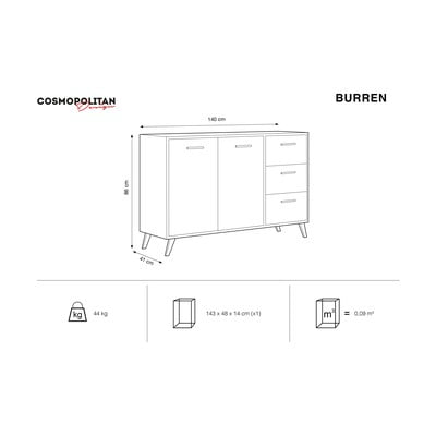 Serija Burren znamke Cosmopolitan Design bo v vašo notranjost vnesla pridih glamurja v nežnih, a raznolikih barvah. Ta komoda bo zagotovo eden od bolj markantnih kosov, ki se ga ne boste naveličali. Navdušile vas bodo njene oblikovnih značilnosti, kot so stožčaste noge, pa tudi uporabnost prostora za shranjevanje. Komodo lahko opremite s svojimi najljubšimi okraski ali cvetjem.