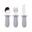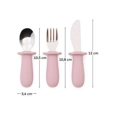 Set vsebuje žlico, vilice in nož. Vsi trije kosi imajo robustne, ergonomske ročaje iz silikona, ki so idealni za majhne otroške roke. Kovinski funkcionalni deli so trpežni, rezilo noža pa je topo in varno za otroke.