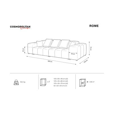 Odkrijte kombinacijo funkcionalnosti in elegance ter izbirajte med številnimi barvnimi možnostmi kavča Rome Velvet. Kavč je sestavljen iz več pravokotnih in kvadratnih modulov, naslonjal za hrbet in roke, ki jih lahko kupite tudi ločeno in tako ustvarite svoj kos, ki bo ustrezal vašim potrebam in vaši notranjosti. Iz modulov lahko sestavite manjši ali večji kavč, kotni kavč ali celo kavč v obliki črke U.