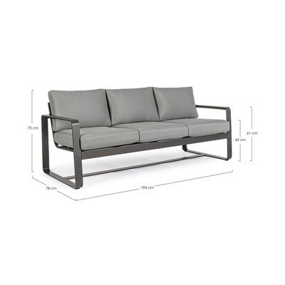 Aluminijasti vrtni kavč Merrigan v sivi barvi prinaša sodobno eleganco v vaš zunanji prostor. Kavč Bizzotto je idealen za sprostitev na terasi, vrtu ali ob bazenu. S preprostim okvirjem iz trpežnega aluminija je kavč dopolnjen z udobnimi blazinami v nevtralni sivi barvi, ki dopolnjujejo njegov minimalistični videz. Zaradi uporabe aluminija je kavč lahek in odporen na vremenske vplive.