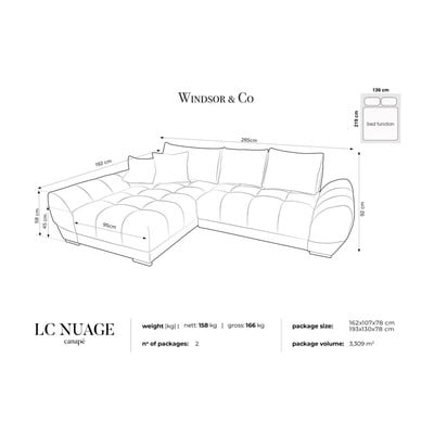 Kotna sedežna garnitura NuageŽametna, raztegljiva/s prostorom za shranjevanje, levi kot/z ležalnikom, siva, vodoodporna/odporna na madeže, štirisedežna, širina 285 cm