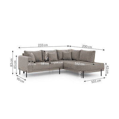 Iz šeniljeDesni kot/v obliki črke LSivorjavaPrimerna za hišne ljubljenčke/odporna na madežeŠtirisedežnaŠirina 233 cm
