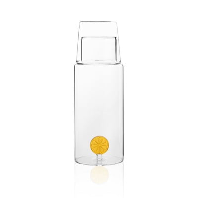 Minimalistično zasnovo dopolnjuje praktična steklena skodelica, ki služi tudi kot pokrov. Karafa ima na dnu zanimiv detajl v obliki rezine limone.