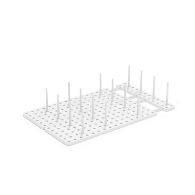 Stojalo za posodo in pokrovke Peggy iz podjetja Umbra se lahko skoraj popolnoma prilagodi shranjeni posodi. Na nedrseči podlagi je 108 lukenj, v katere lahko po želji namestite šestnajst priloženih zatičev.