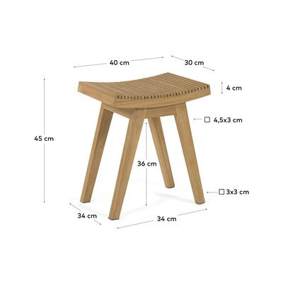Stolček Vicentina znamke Kave Home je izdelan iz masivnega tikovega lesa. Njegov sedežni del je izdelan iz ukrivljenih letvic, ki mu dajejo sodoben videz. Zaradi odpornosti na vlago je ta stolček praktičen in eleganten dodatek za kopalnico ali druge prostore z večjo vlažnostjo.