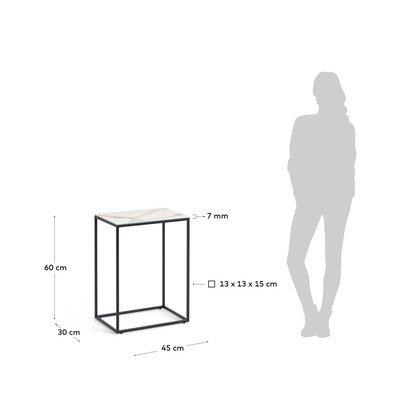 Stranska mizica Rewena znamke Kave Home je zasnovana z mislijo na praktičnost in vzdržljivost. Njena plošča je izdelana iz porcelana, za katerega je značilna visoka odpornost na tekočine, visoke temperature in obrabo. Na fotografiji je viden droben vzorec, ki spominja na marmor.