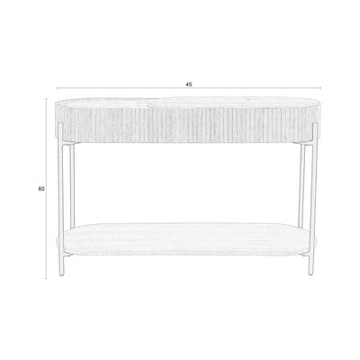 Kombinacija hrastovega furnirja in kovinskih nog, prevlečenih s črnim prašnim premazom, ustvarja harmonično celoto. Mizica ima dimenzije 36 x 120 cm.