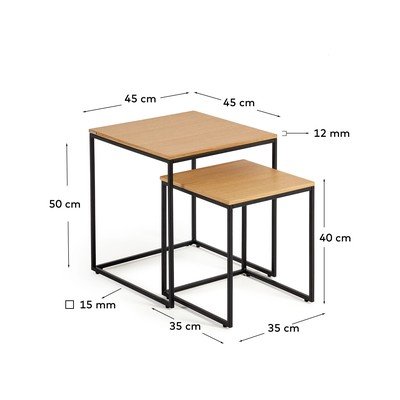 Komplet stranskih mizic Yoana znamke Kave Home je praktičen in eleganten dodatek vaši notranjosti. Sestavljen je iz dveh mizic, ki se popolnoma prilegata skupaj, zato ju lahko po potrebi razstavite ali shranite.