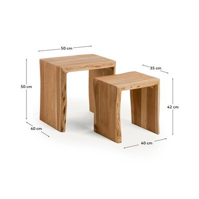 Komplet mizic Lomiri znamke Kave Home je izredno praktičen, saj ju je mogoče preprosto potisniti eno v drugo. Izdelani sta iz masivnega akacijevega lesa, ki jima daje trdnost in naravni videz.