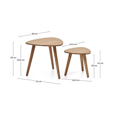 Stranski mizici Duvani znamke Kave Home v kompletu sta praktični, saj ju je mogoče preprosto potisniti eno v drugo. Izdelani sta iz masivnega akacijevega lesa.
