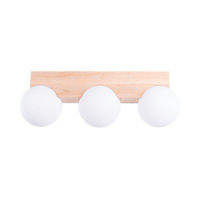 Stropna svetilka Solum znamke Sollux. Kombinacija naravnega lesa in steklenih senčil ustvarja prijetno razpršeno svetlobo.