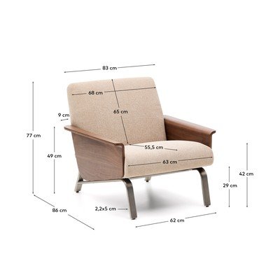 Konstrukcija fotelja združuje trpežno 18 mm debelo vezano ploščo, prekrito z hrastovim furnirjem, z vizualno privlačnimi, minimalistično oblikovanimi nasloni za roke. Noge iz brušenega nerjavečega jekla s premerom 1,8 mm poudarjajo sodoben in stabilen videz. Fotelj ponuja idealno srednjo trdoto sedišča za vsakodnevno uporabo, zahvaljujoč premišljeni kombinaciji trakov, vzmeti in plasti pene visoke gostote (35 kg/m³ in 40 kg/m³), ki zagotavljajo trdnost, vzdržljivost in izjemno udobje.