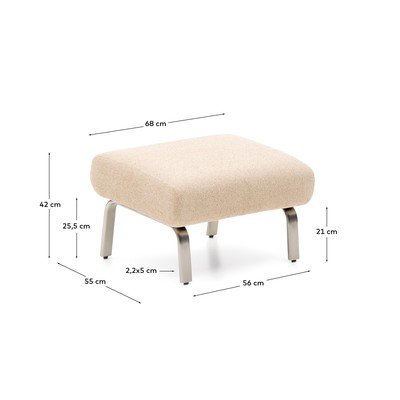 Noge iz brušenega nerjavečega jekla s premerom 1,8 mm imajo elegantno zaobljeno obliko in tabureju zagotavljajo moderno in stabilno podlago. Sedežna blazina ponuja srednjo trdoto, idealno za vsakodnevno uporabo. To je doseženo zahvaljujoč kombinaciji trakov, vzmeti in plasti pene visoke gostote (35 kg/m³ in 40 kg/m³), ki zagotavljajo trdnost, vzdržljivost in izjemno udobje.