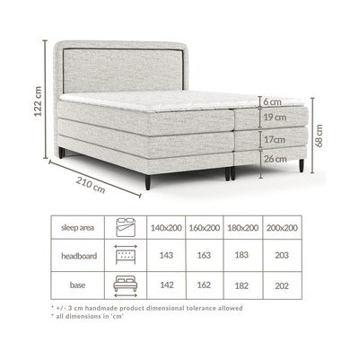 Ta boxspring postelja zagotavlja nezamenljivo udobje zaradi dveh vrst ležišč v štirih ločenih delih. Medtem ko je spodnje ležišče z višino 17 cm sestavljeno iz vzmeti bonell in poliuretanske pene, je zgornje ležišče z višino 19 cm izdelano iz žepkastih vzmeti, nameščenih v posameznih žepkih.