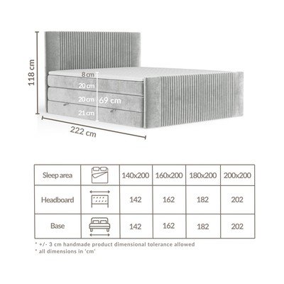 Poleg udobja postelja ponuja tudi praktičen prostor za shranjevanje, ki vam bo pomagal ohraniti red v spalnici. Trdna konstrukcija in nosilnost 240 kg zagotavljata, da je postelja trpežna in stabilna.