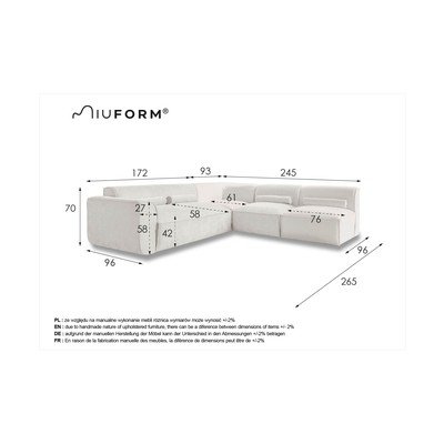Desni kot/v obliki črke LSvetlo sivaVečsedežnaŠirina 265 cmGlobina 245 cmGlobina sedeža 58 cm