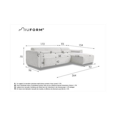 Desni kot/z ležalnikomSvetlo sivaTrisedežnaŠirina 264 cmGlobina 154 cmGlobina sedeža 58 cm