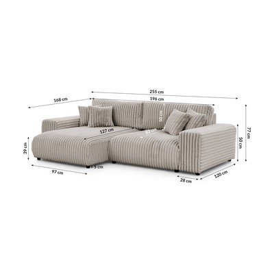 Iz rebrastega žametaRaztegljiva/s prostorom za shranjevanjeLevi kotSvetlo sivaVodoodporna/odporna na madežeTrisedežnaŠirina 255 cm