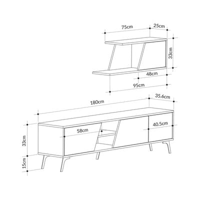 Ta televizijski komplet sestavljata TV omarica, ki meri 180 cm x 48 cm x 35,6 cm, in stenska polica, ki meri 95 cm x 33 cm x 25 cm.