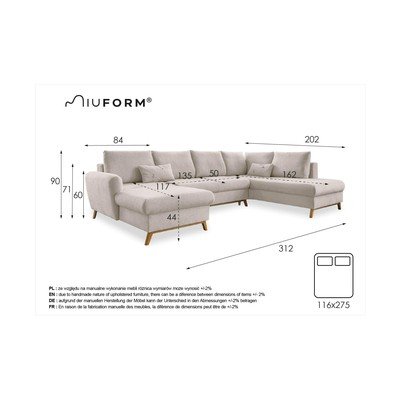 Zofa Lagom združuje preprostost, funkcionalnost in estetiko. Zaradi oblike črke U je velika in prostorna. Osnovna konstrukcija in visoke noge so izdelane iz bukovega lesa, ki je stabilen in v notranjost vnaša skandinavski slog. Ima način zlaganja in prostor za shranjevanje. Zato jo lahko uporabite kot posteljo za goste. Naj vas blagovna znamka Miuform osupne.