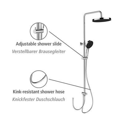 Dežna glava je opremljena s skupno 416 vgrajenimi šobami, ki nežno pršijo vodo po koži. Ročna glava za prhanje s 324 šobami ponuja skupno 3 funkcije vodnega curka - dež, masažo in intenzivne nastavitve. Dopolnjuje jo 150 cm dolga cev, ki je odporna na zvijanje in prepogibanje.