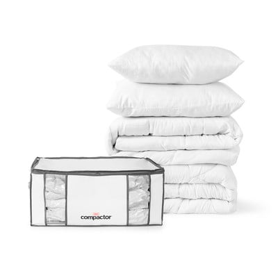 Idealno. V tej škatli sem stisnil pilot 220 cm × 200 cm in nekaj blazin. Vanj bi lahko spravila več tekstila, vendar ga nisem želela preveč zmečkati.