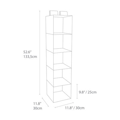 Praktični viseči organizator vam s petimi predali pomaga shraniti oblačila. Idealen je za obešanje v omari. Izdelan je iz kartona in trpežnega poliestra. Trdno se drži zaradi zapenjanja z velkro trakom. Izdelek lahko po potrebi kadar koli zložite, da prihranite prostor.